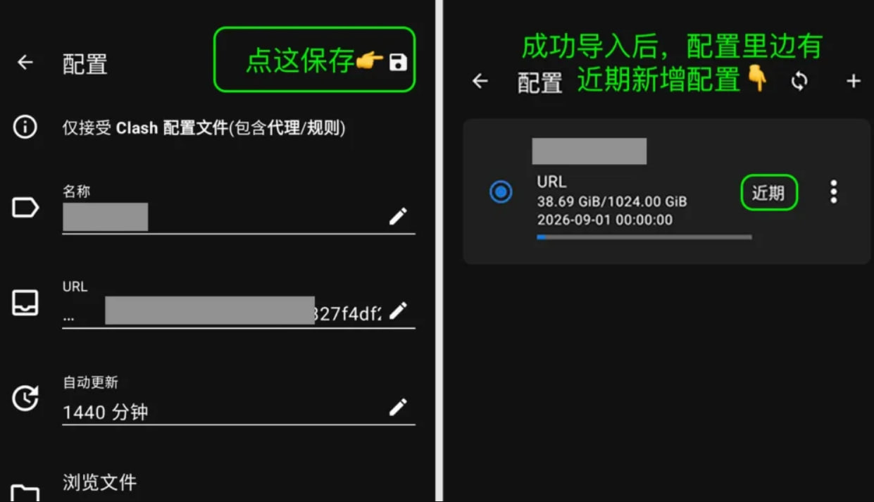 1. 成功保存后会回到首页。点击配置就能看到:新配置(几秒前),这就表示已成功导入Clash节点订阅啦,