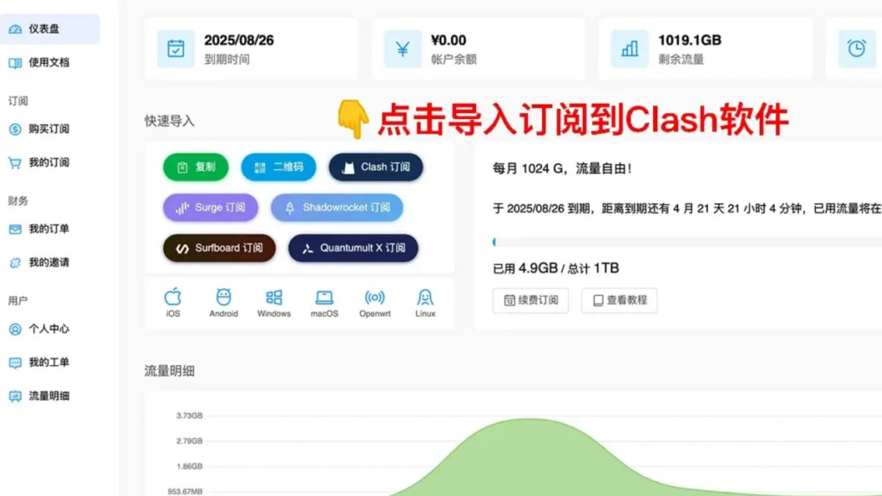 2. 这里的导入到 ClashXXX 软件,是所有Clash软件都通用的一键导入。如果你无法成功一键导入,或者已经有Clash节点订阅链接了,可以参考下面的手动导入订阅方法。